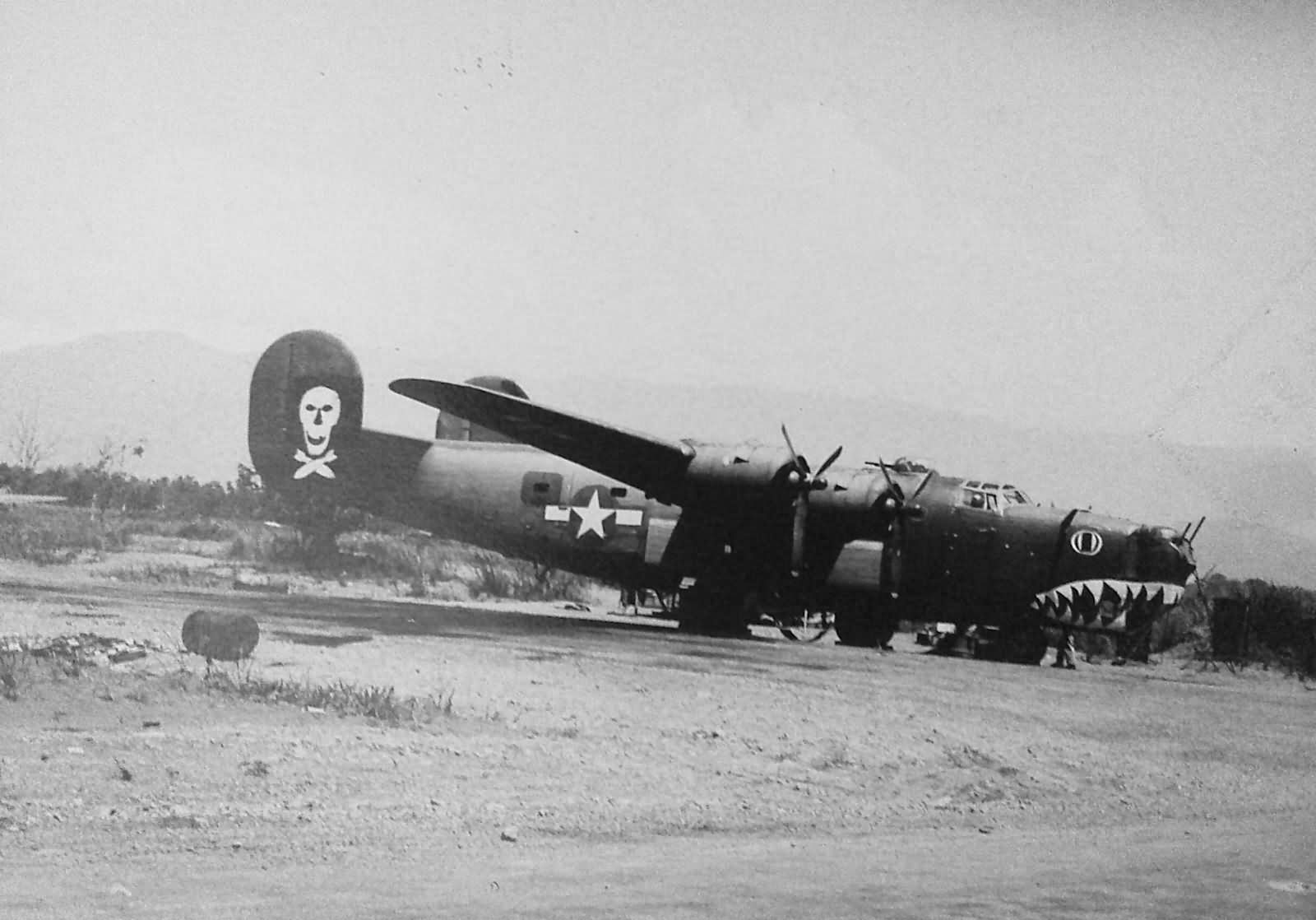 [The “sharkmouth” addition to my captioning is because there are just so many sharkmouthed B-24s around that I note all of them like this so that when a photo which can’t be identified but carries a sharkmouth turns up I can easily pull all of them from my collection and compare and contrast in the hopes of making an identity.]