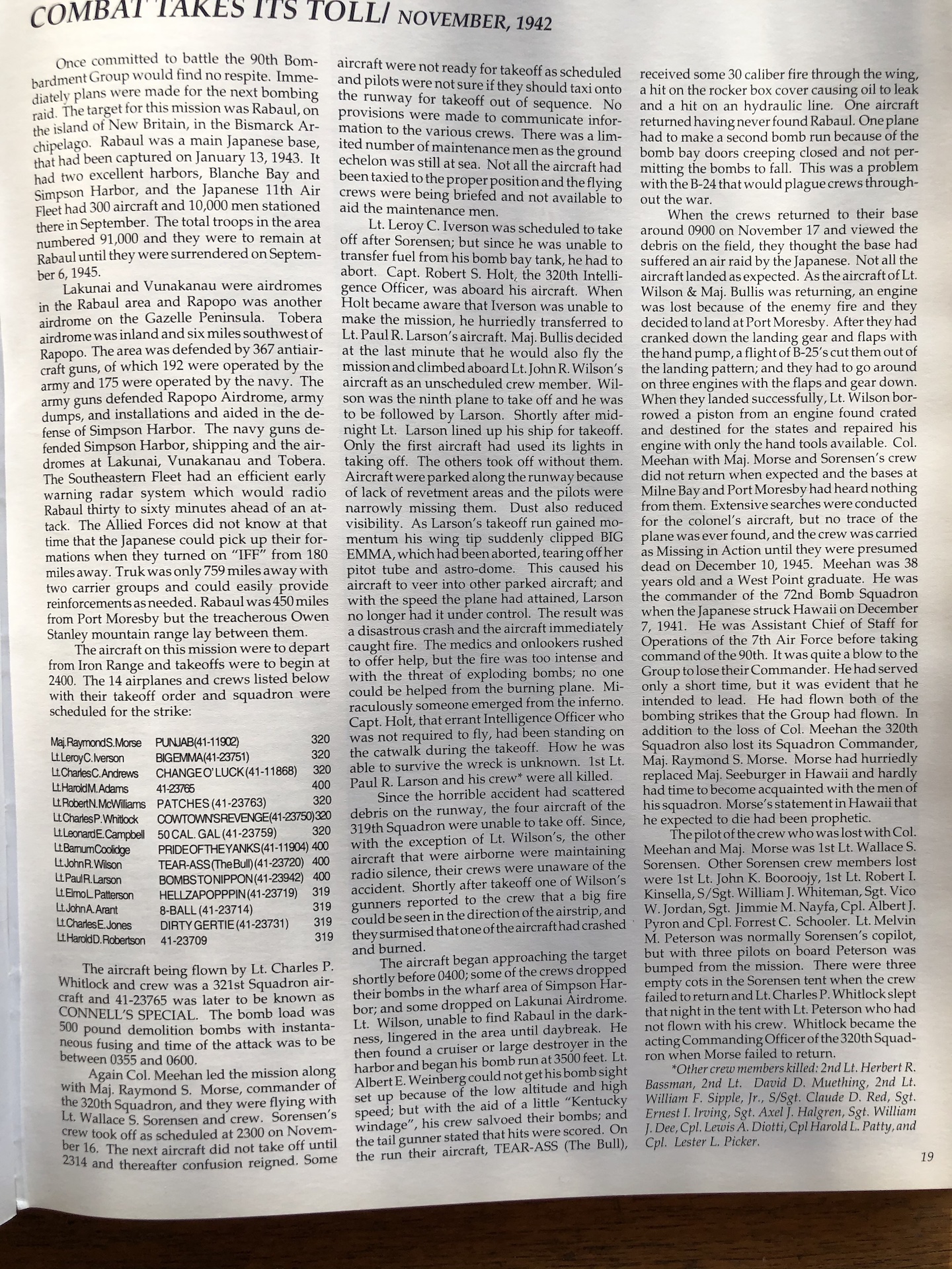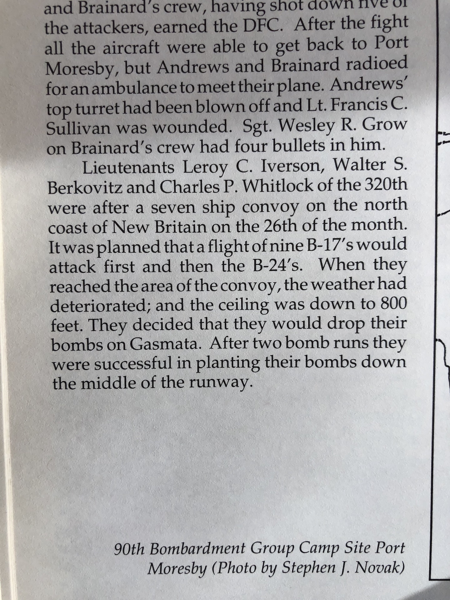 IVERSON, LEROY C. #437415, 320th Sqdn. crew # 1, Middleton, Arthur J. #725630, (cp), Arones, Harold #791020, (n), Snokelburg, George A.#726957, (b), Humphreys, Lee #16034463, (e), Palumbo, Nello, F. #12031018, (ro), Ryan, Harry E. #31019040, (g), Smith, Evan B. #17041123, (g), Cantrell, Jack R. #18040259, (g), Moczan, William S. #7025896, (g). From Case’s orders, dated 4-12-1943, credited 2 zeros over Hansa Bay.