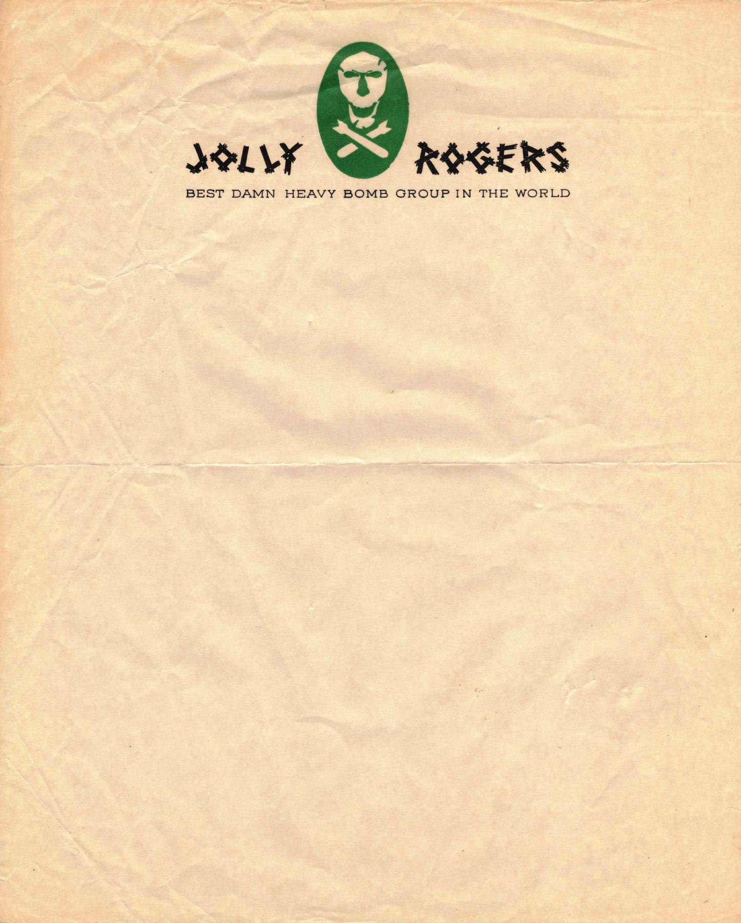 My father, James T. Freeman of Oklahoma City, was a gunner/photographer on the crew of Lt. James M. Atkins in the 321st "Bombs Away" Squadron. I don't seem to have any names or information for other members of the crew and would be interested to know if anyone here does. I have a fair amount of photos I can share, have my dad's Jolly Rogers patches, yearbooks, ring, and assorted other stuff. I'm attaching a pic of the crew (dad is down in front in the light color fatigues) and a scan of an interesting item I've never seen pics of before—a sheet of onion skin Jolly Rogers stationery my dad managed to hang onto for all those years. Looking forward to hearing from folks, and hope y'all have a Merry Christmas and happy holidays.