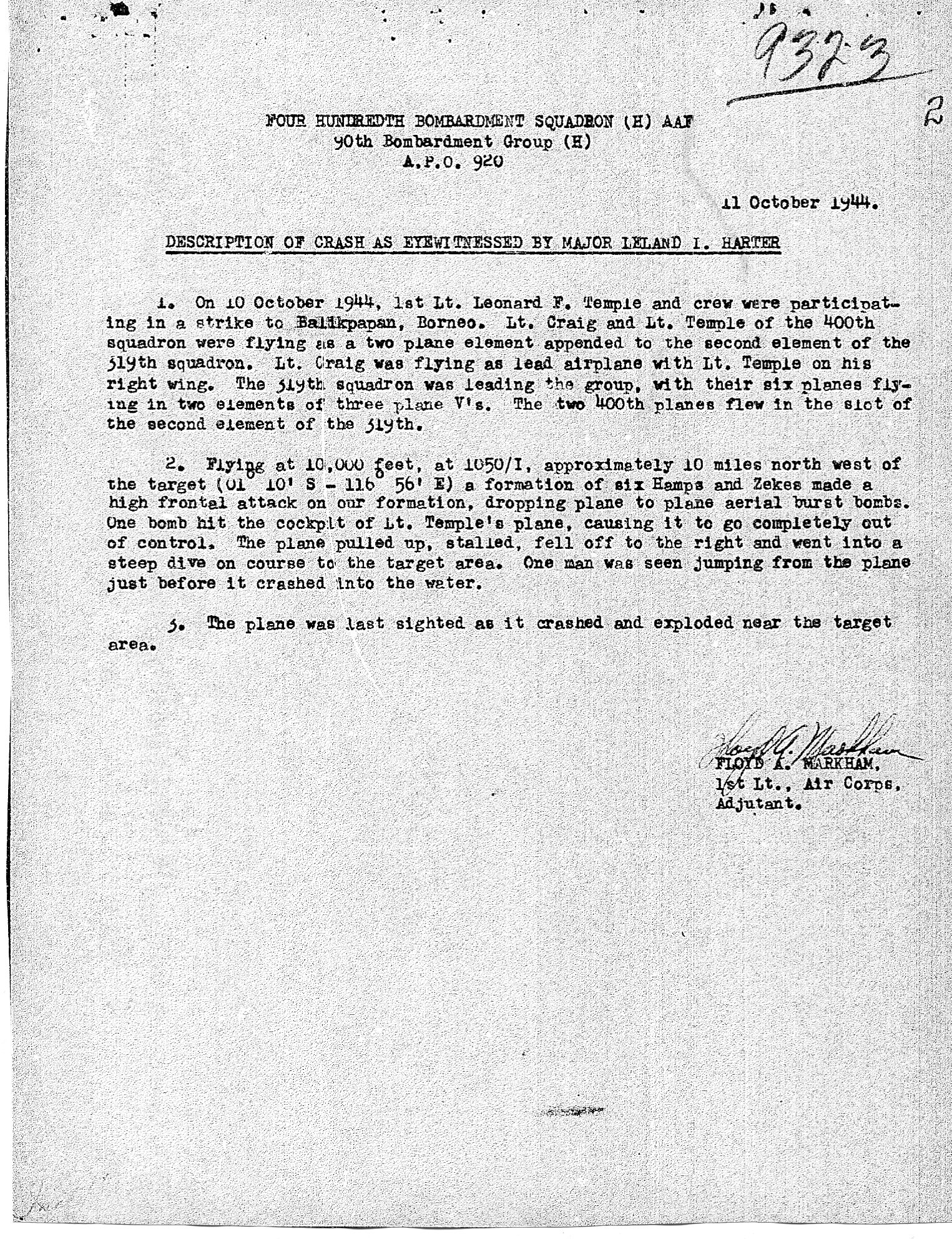 TEMPLE, LEONARD F. #564457, 400th Sqdn, Mower, John L. #760848, (cp), Tanner, Holden L. #700677, (n), Pappas, John G. #701632, (b), Sabine, Herbert M. #39200708, (e), Geraldson, Stanley E. #16116405, (ro), Vugts, Martin P. #20139903, (ng), McGee, Gerald #14160846, (ae), Hammons, Denver F. #38505099, (tg), Ryder, Roy N. but was he aboard? From my M A C R, #9323, dated 10-10-1944, plane # 44-40368, phosphorus bombed near Balikappan, crashrd and all aboard K I A.