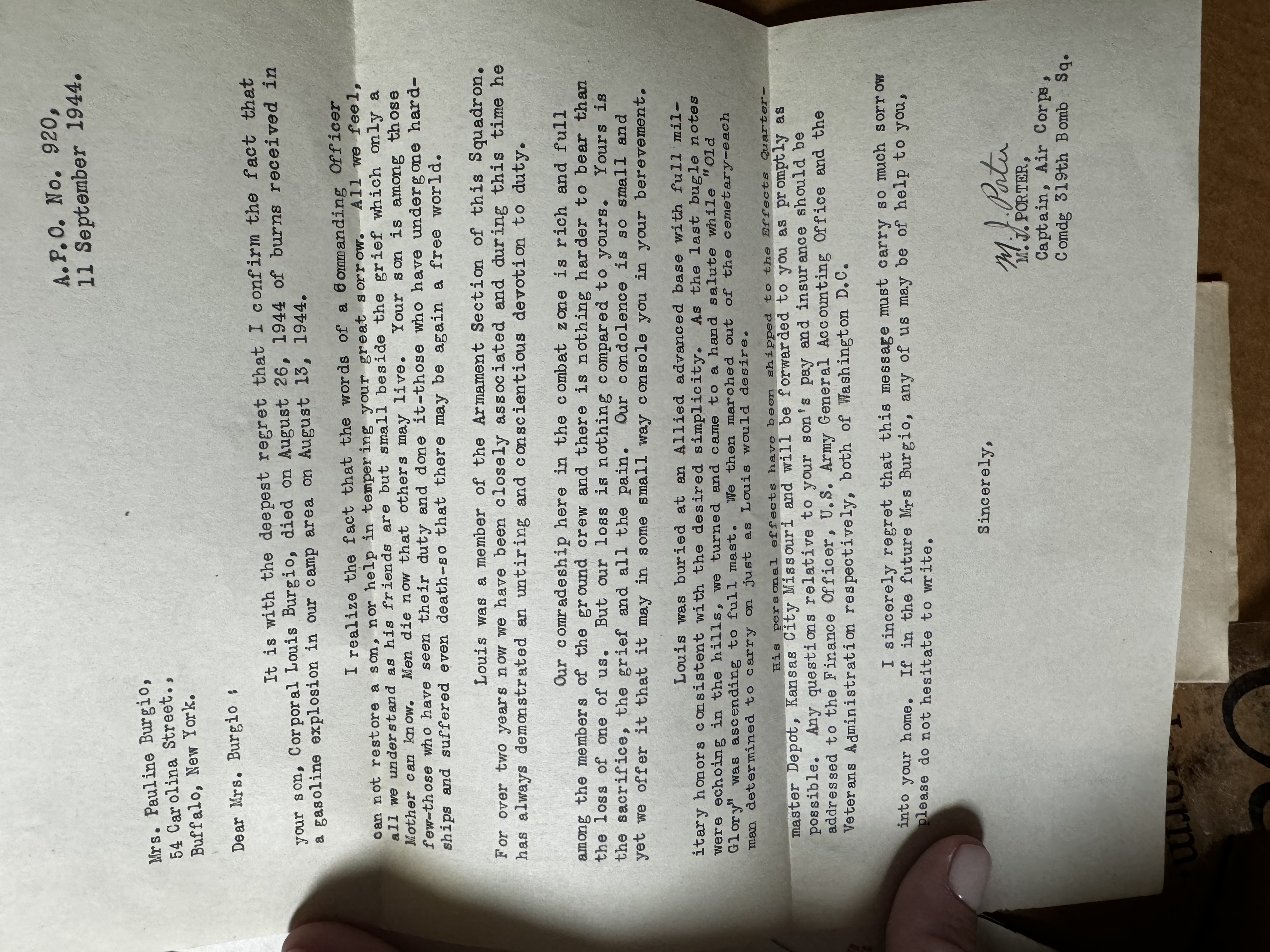 I know he succumbed to his injuries in Aug of ‘44 from what appears to be a plane crash. Based on letter I have, he was in the hospital recovering for a week or so and then seemingly passed away suddenly.