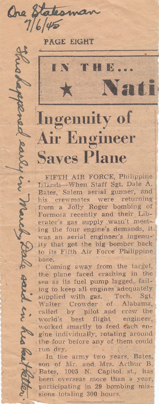 Sadly I report that Dale Bates passed away yesterday. Dale was just short of his 100th birthday. Dale was in the 321st Squadron and was a waist gunner on the Curtis Jury crew. Dale was the final secretary of the 90th Association and served for many years.