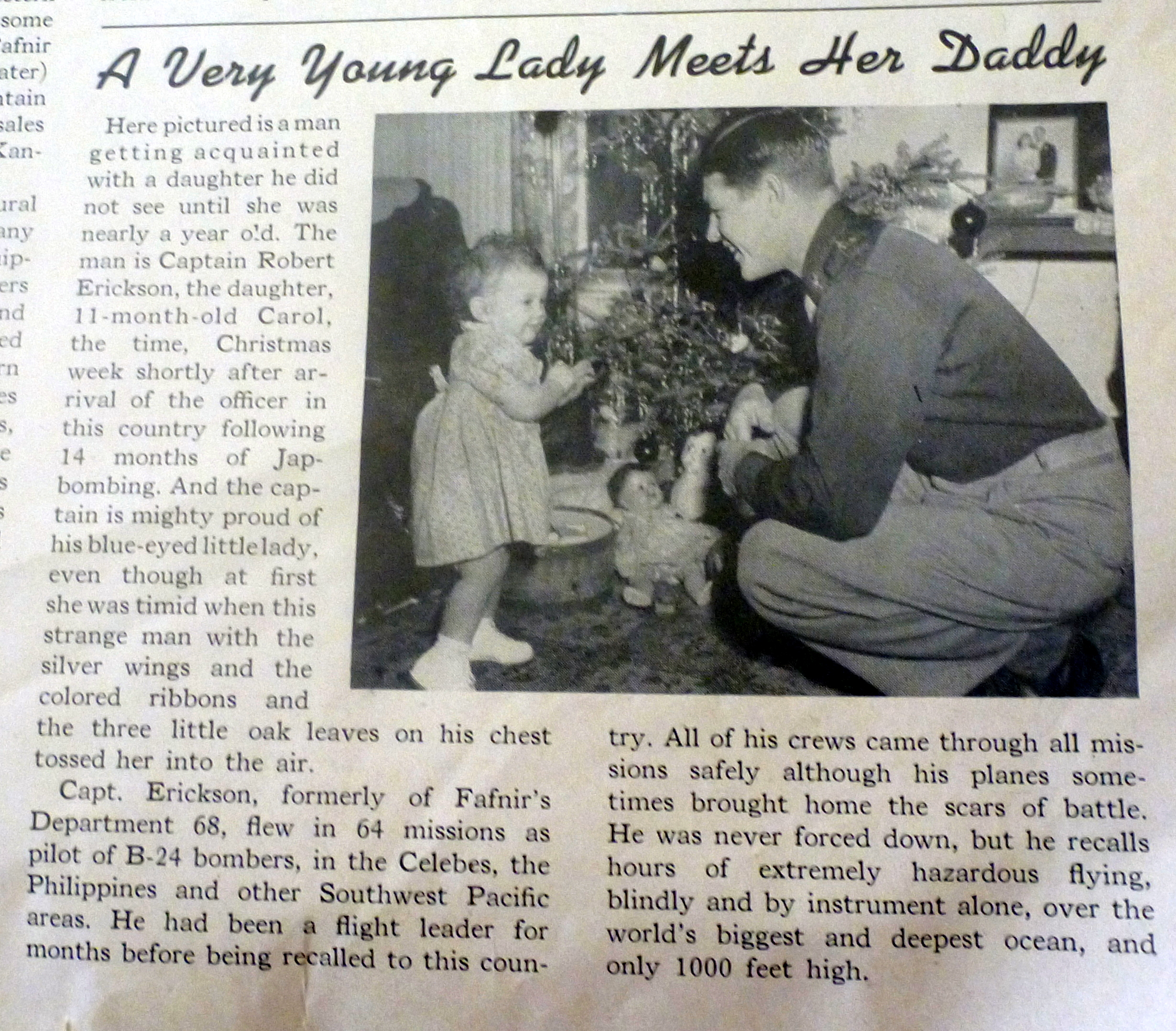 My father Robert Emmett Erickson was a Captain in the Jolly Rogers, he was born in Connecticut. A few years back I was able to find a little bit about him but the website seems to have been abandoned or inactive. I am interested in finding out the plane (or planes he may have flown) and am hoping there is an existing crew photo with him included. I am attaching a photo of him and also and article that was published in Fafnir News (a company publication) in 1945.