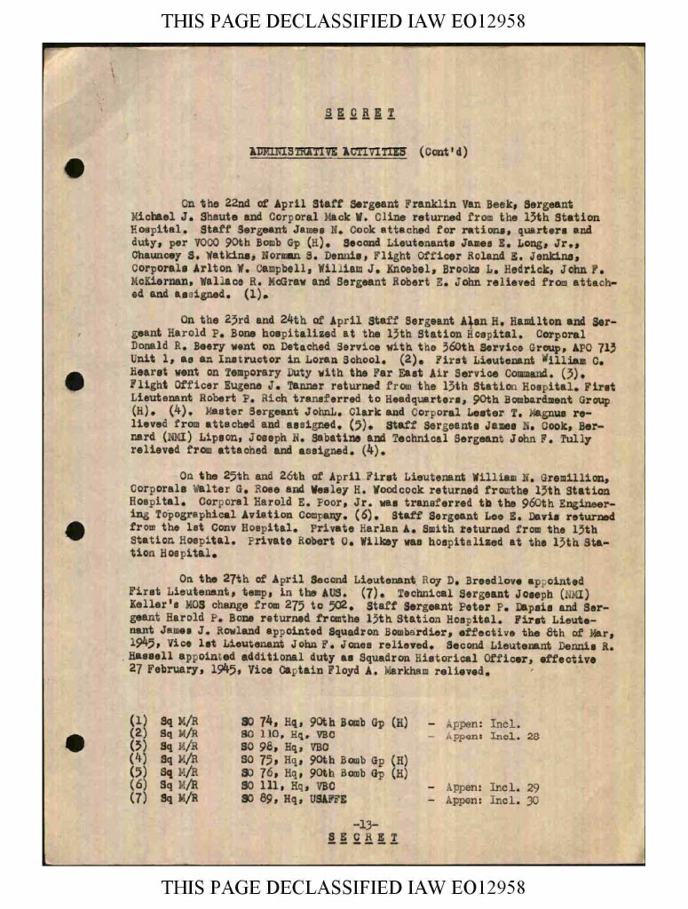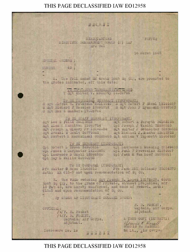 Wow! Sorry I didn't respond to this quicker. Been extremely busy. Never knew he was sent to the hospital at all! Where did you get this information? Where can I get a copy of the documentation of whatever you used? This is extremely exciting for me! Thank you so much!Bob Tupa wrote: ↑18 May 2020 2129 Your great grandfather was a mechanic in the 90th Bomb Group assigned to the 400th Squadron. It appears he joined them in 1943 and stayed with them til the end of the war. I saw that he was promoted to Staff Sergeant in March of 45 and sent to the hospital in April of 45. His serial number was 11040714