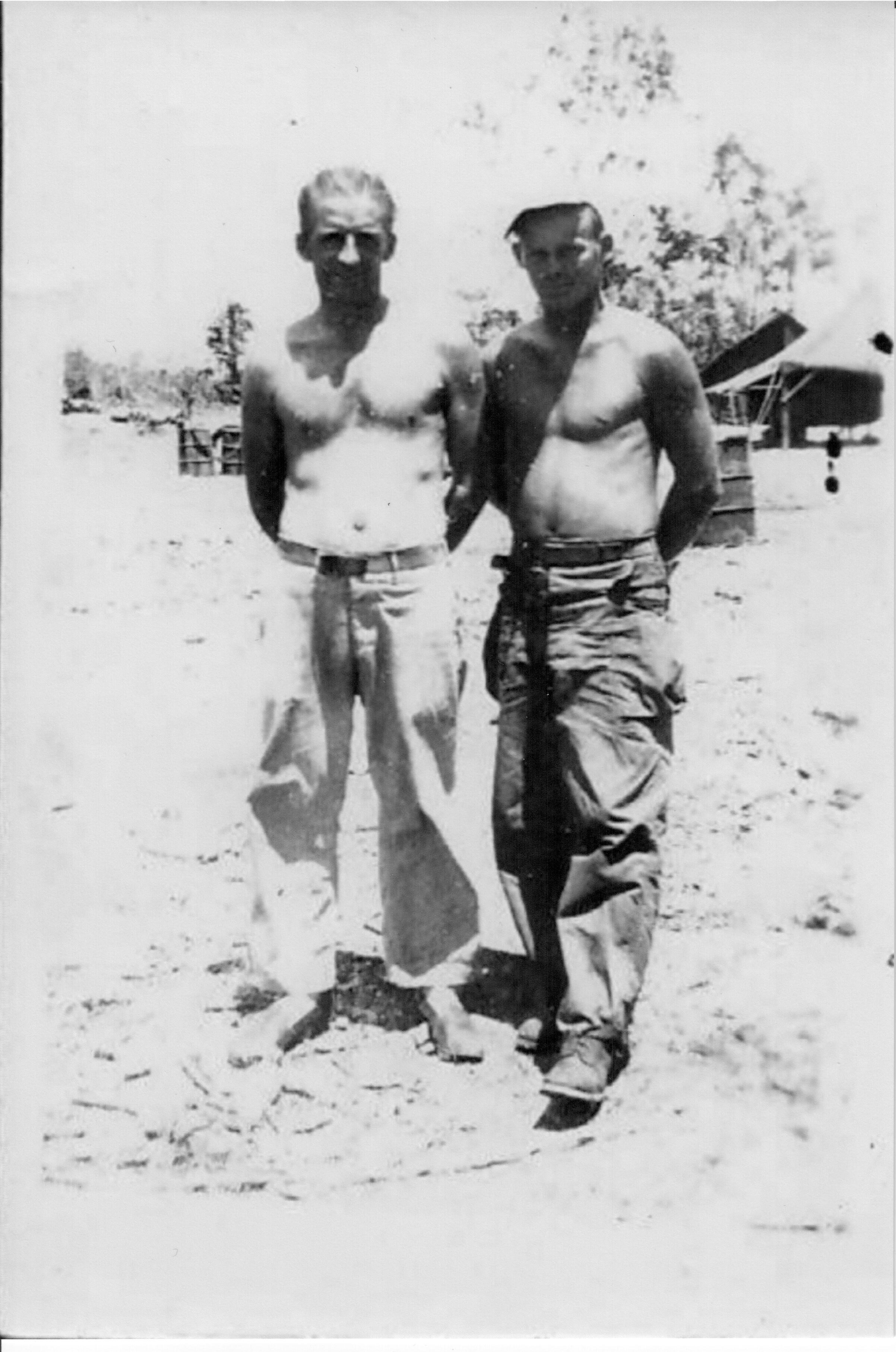 Exactly what the subject title says. Standing on the right is Alan Hamilton, my great-grandfather, a mechanic for the 400th Bomb Squadron, the gentleman on the left is unknown to me, but please, do let me know if you have any clue. Exact location is also unknown, but is certainly an airfield. I am currently attempting to restore this photograph to the best of my ability, bring down the contrast so more detail in the back can be seen, and eventually colorize it, but location does play a huge role in the color. If you look at the feet of the man on the left, he appears to have prosthetic feet, judging by the size compared to Alan's boots and the blocky-shape, looking like it was carved from wood. Any information on anything is appreciated greatly! I believe I have more images scattered around the family that I will be tracking down and posting here if they're relevant to the 90th Bomb Group. Thanks in advance!