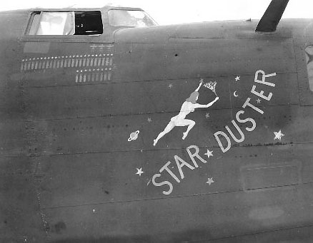 Starduster joined the Jolly Rogers when she had the distinction of being the only B-24 with a belly gun. That rather surprised the first Zekes who attacked her from below. The first was blown to hell - the others beat it to hell away. Starduster proudly served a General on her first night mission over Rabaul. On one of her missions her rudder cable was shot away, but she murdered the Zeke that did it and another for good measure. Boat hungry, Starduster once beached one and skip bombed a four ship convoy.Badly hit, she had to salvo everything she could to make a safe landing at a nearby base. Before returning to the States with 67 missions, she'd sunk two boats, damaged one, and shot down no less than eleven Zeros. Only one of her crew were ever wounded. Click HERE for photo. |
